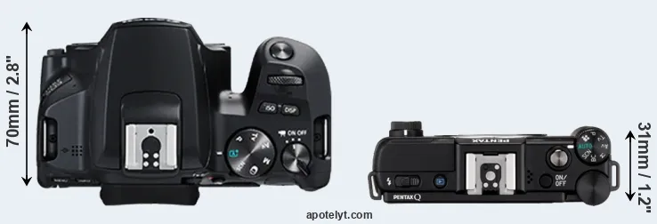 An illustration of the physical size and weight of the Canon 250D and the Pentax Q is provided in the side-by-side display below. The two cameras are presented according to their relative size. Three successive views from the front, the top, and the rear are shown. All width, height and depth dimensions are rounded to the nearest millimeter.
