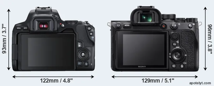 The physical size and weight of the Canon 250D and the Sony A7R IV are illustrated in the side-by-side display below. The two cameras are presented according to their relative size. Three consecutive perspectives from the front, the top, and the back are available. All size dimensions are rounded to the nearest millimeter.