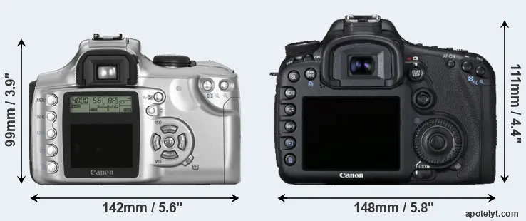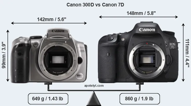 If the front view area (width x height) of the cameras is taken as an aggregate measure of their size, the Canon 7D is notably larger (17 percent) than the Canon 300D. Moreover, the 7D is markedly heavier (33 percent) than the 300D. It is noteworthy in this context that the 7D is splash and dust-proof, while the 300D does not feature any corresponding weather-sealing.
