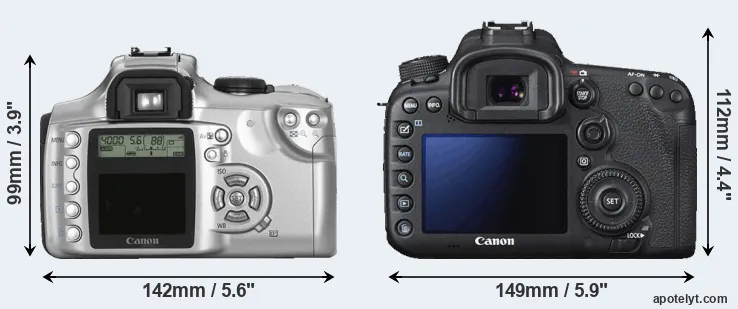 If the front view area (width x height) of the cameras is taken as an aggregate measure of their size, the Canon 7D II is notably larger (19 percent) than the Canon 300D. Moreover, the 7D Mark II is substantially heavier (40 percent) than the 300D. It is noteworthy in this context that the 7D Mark II is splash and dust-proof, while the 300D does not feature any corresponding weather-sealing.