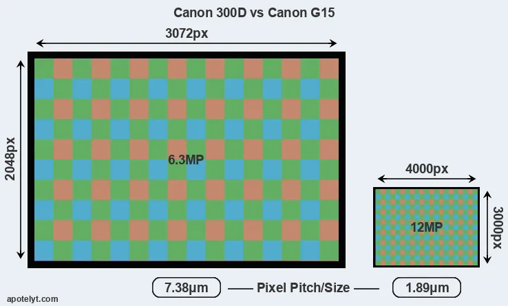 Despite having a smaller sensor, the G15 offers a higher resolution of 12 megapixels, compared with 6.3 MP of the 300D. This megapixels advantage comes at the cost of a higher pixel density and a smaller size of the individual pixel (with a pixel pitch of 1.89μm versus 7.38μm for the 300D). However, it should be noted that the G15 is much more recent (by 9 years and 1 month) than the 300D, and its sensor will have benefitted from technological advances during this time that make it possible to gather light more efficiently.