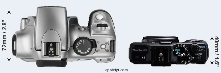 The physical size and weight of the Canon 300D and the Canon G15 are illustrated in the side-by-side display below. The two cameras are presented according to their relative size. Three successive views from the front, the top, and the rear are shown. All width, height and depth measures are rounded to the nearest millimeter.