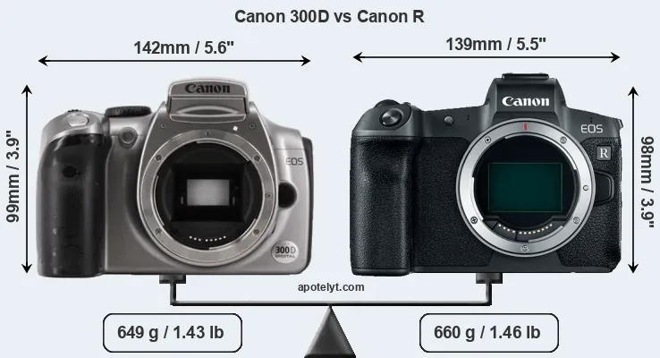 Technology-wise, the Canon R uses a more advanced image processing engine (DIGIC 8) than the 300D (DIGIC), with benefits for noise reduction, color accuracy, and processing speed.