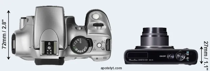 The above size and weight comparisons are to some extent incomplete and possibly misleading, as the SX610 has a lens built in, whereas the 300D is an interchangeable lens camera that requires a separate lens. Attaching the latter will add extra weight and bulk to the setup. You can compare the optics available for the 300D and their specifications in the Canon EF Lens Catalog.