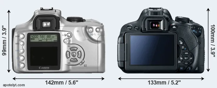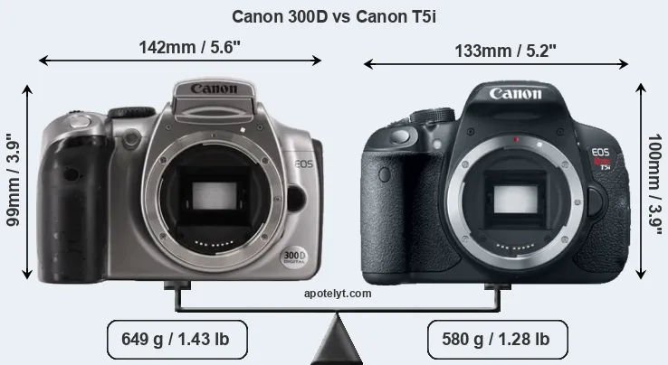 The side-by-side display below illustrates the physical size and weight of the Canon 300D and the Canon T5i. The two cameras are presented according to their relative size. Three successive views from the front, the top, and the rear are shown. All size dimensions are rounded to the nearest millimeter.