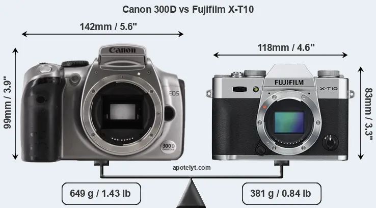 If the front view area (width x height) of the cameras is taken as an aggregate measure of their size, the Fujifilm X-T10 is considerably smaller (30 percent) than the Canon 300D. Moreover, the X-T10 is substantially lighter (41 percent) than the 300D. In this context, it is worth noting that neither the 300D nor the X-T10 are weather-sealed.