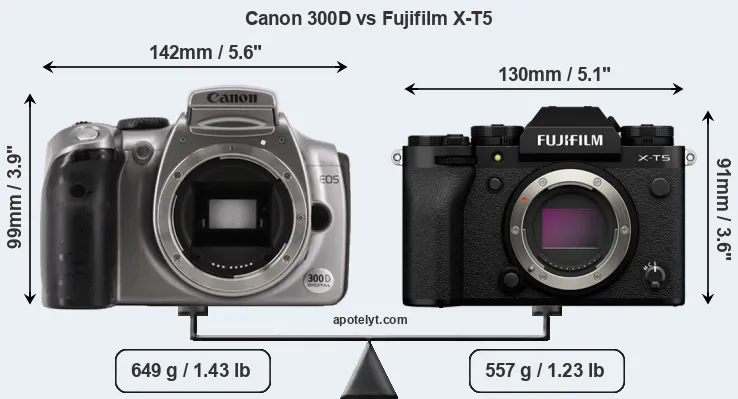 If the front view area (width x height) of the cameras is taken as an aggregate measure of their size, the Fujifilm X-T5 is notably smaller (16 percent) than the Canon 300D. Moreover, the X-T5 is markedly lighter (14 percent) than the 300D. It is noteworthy in this context that the X-T5 is splash and dust-proof, while the 300D does not feature any corresponding weather-sealing.