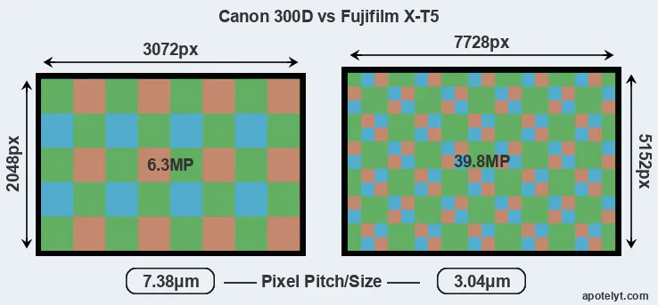 | Sensor Specs | Canon 300D | Fujifilm X-T5 |