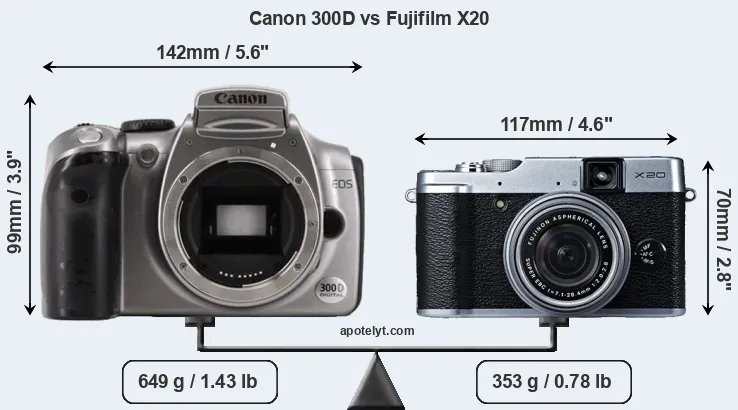 If the front view area (width x height) of the cameras is taken as an aggregate measure of their size, the Fujifilm X20 is considerably smaller (42 percent) than the Canon 300D. In this context, it is worth noting that neither the 300D nor the X20 are weather-sealed.