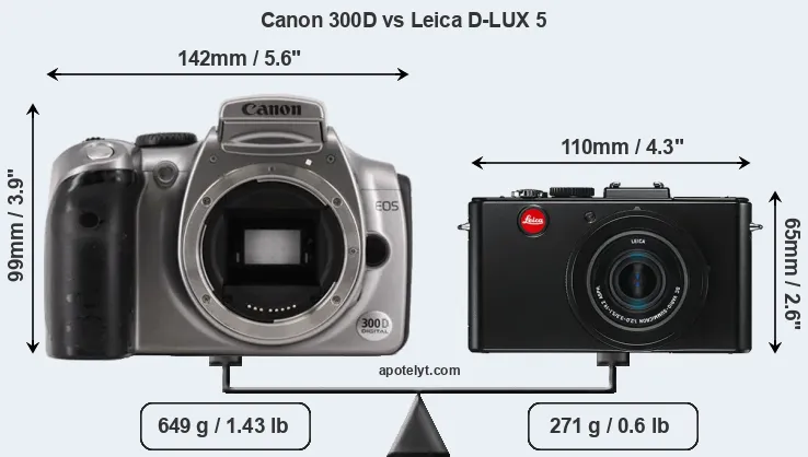 If the front view area (width x height) of the cameras is taken as an aggregate measure of their size, the Leica D-LUX 5 is considerably smaller (49 percent) than the Canon 300D. In this context, it is worth noting that neither the 300D nor the D-LUX 5 are weather-sealed.