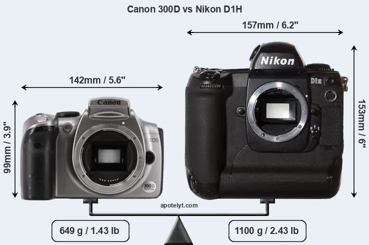 If the front view area (width x height) of the cameras is taken as an aggregate measure of their size, the Nikon D1H is considerably larger (71 percent) than the Canon 300D. Moreover, the D1H is substantially heavier (69 percent) than the 300D. It is noteworthy in this context that the D1H is splash and dust-proof, while the 300D does not feature any corresponding weather-sealing.