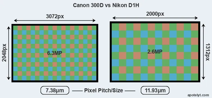 Despite having a smaller sensor, the Canon 300D offers a higher resolution of 6.3 megapixels, compared with 2.6 MP of the Nikon D1H. This megapixels advantage comes at the cost of a higher pixel density and a smaller size of the individual pixel (with a pixel pitch of 7.38μm versus 11.93μm for the D1H). However, it should be noted that the 300D is much more recent (by 2 years and 6 months) than the D1H, and its sensor will have benefitted from technological advances during this time that make it possible to gather light more efficiently.