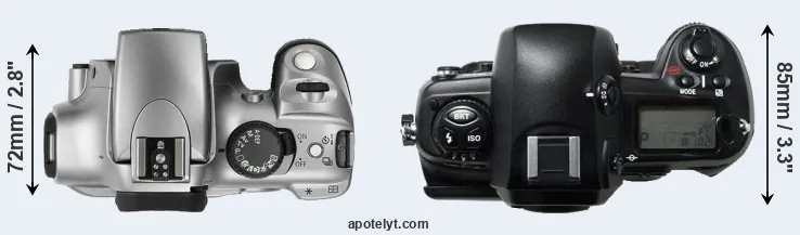 An illustration of the physical size and weight of the Canon 300D and the Nikon D1H is provided in the side-by-side display below. The two cameras are presented according to their relative size. Three consecutive views from the front, the top, and the rear side are shown. All width, height and depth measures are rounded to the nearest millimeter.