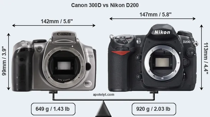 The side-by-side display below illustrates the physical size and weight of the Canon 300D and the Nikon D200. The two cameras are presented according to their relative size. Three consecutive perspectives from the front, the top, and the back are available. All width, height and depth measures are rounded to the nearest millimeter.