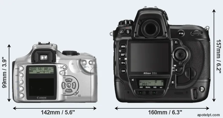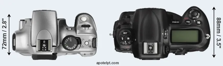An illustration of the physical size and weight of the Canon 300D and the Nikon D3X is provided in the side-by-side display below. The two cameras are presented according to their relative size. Three successive views from the front, the top, and the rear are shown. All width, height and depth measures are rounded to the nearest millimeter.