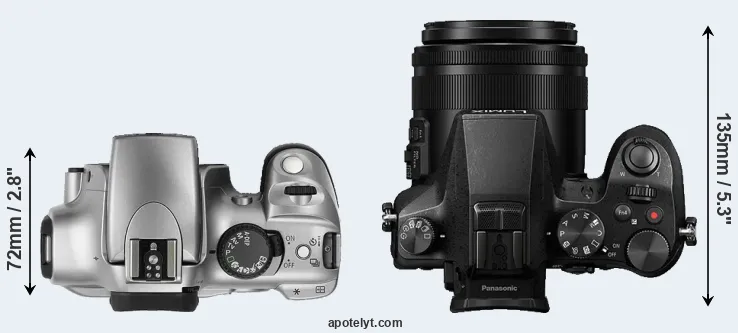 Going beyond this snapshot of core features and characteristics, what are the differences between the Canon EOS 300D and the Panasonic Lumix DMC-FZ2000? Which one should you buy? Read on to find out how these two cameras compare with respect to their body size, their imaging sensors, their shooting features, their input-output connections, and their reception by expert reviewers.