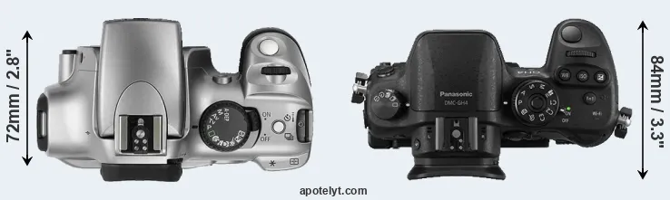 An illustration of the physical size and weight of the Canon 300D and the Panasonic GH4 is provided in the side-by-side display below. The two cameras are presented according to their relative size. Three successive views from the front, the top, and the rear are shown. All width, height and depth dimensions are rounded to the nearest millimeter.