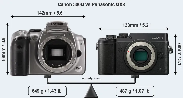 The physical size and weight of the Canon 300D and the Panasonic GX8 are illustrated in the side-by-side display below. The two cameras are presented according to their relative size. Three consecutive perspectives from the front, the top, and the back are available. All width, height and depth dimensions are rounded to the nearest millimeter.