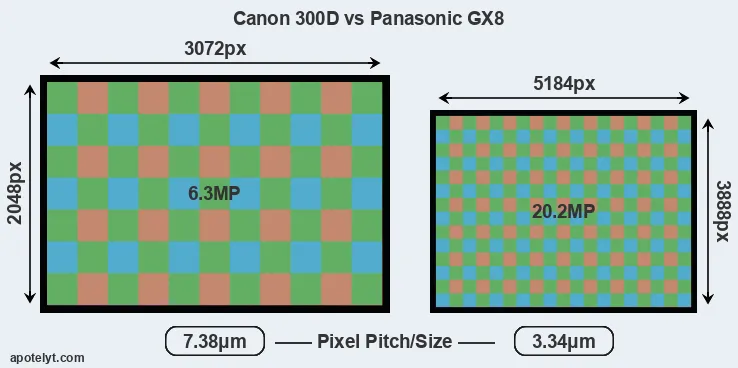 Despite having a smaller sensor, the GX8 offers a higher resolution of 20.2 megapixels, compared with 6.3 MP of the 300D. This megapixels advantage comes at the cost of a higher pixel density and a smaller size of the individual pixel (with a pixel pitch of 3.34μm versus 7.38μm for the 300D). However, it should be noted that the GX8 is much more recent (by 11 years and 10 months) than the 300D, and its sensor will have benefitted from technological advances during this time that make it possible to gather light more efficiently.