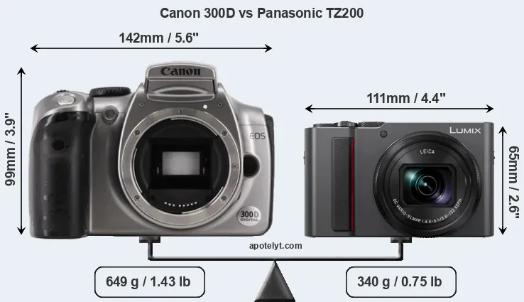 An illustration of the physical size and weight of the Canon 300D and the Panasonic TZ200 is provided in the side-by-side display below. The two cameras are presented according to their relative size. Three consecutive views from the front, the top, and the rear side are shown. All width, height and depth dimensions are rounded to the nearest millimeter.