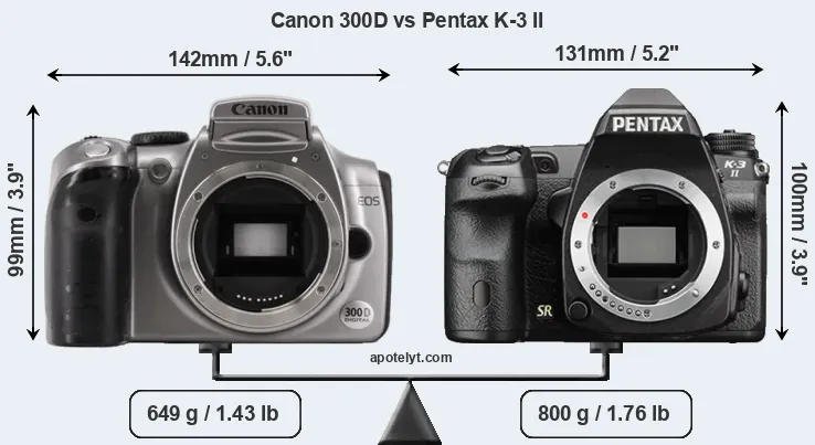 The side-by-side display below illustrates the physical size and weight of the Canon 300D and the Pentax K-3 II. The two cameras are presented according to their relative size. Three consecutive views from the front, the top, and the rear side are shown. All width, height and depth dimensions are rounded to the nearest millimeter.