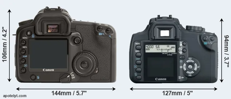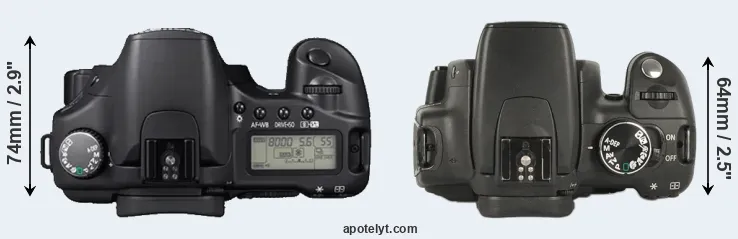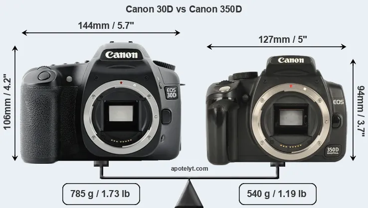 An illustration of the physical size and weight of the Canon 30D and the Canon 350D is provided in the side-by-side display below. The two cameras are presented according to their relative size. Three successive views from the front, the top, and the rear are shown. All width, height and depth dimensions are rounded to the nearest millimeter.