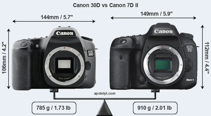If the front view area (width x height) of the cameras is taken as an aggregate measure of their size, the Canon 7D II is notably larger (9 percent) than the Canon 30D. Moreover, the 7D Mark II is markedly heavier (16 percent) than the 30D. It is noteworthy in this context that the 7D Mark II is splash and dust-proof, while the 30D does not feature any corresponding weather-sealing.