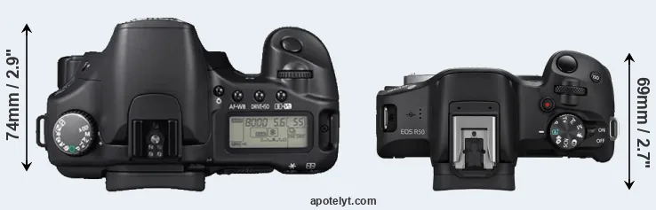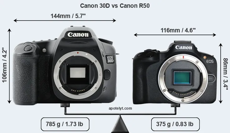 The side-by-side display below illustrates the physical size and weight of the Canon 30D and the Canon R50. The two cameras are presented according to their relative size. Three consecutive views from the front, the top, and the rear side are shown. All width, height and depth measures are rounded to the nearest millimeter.