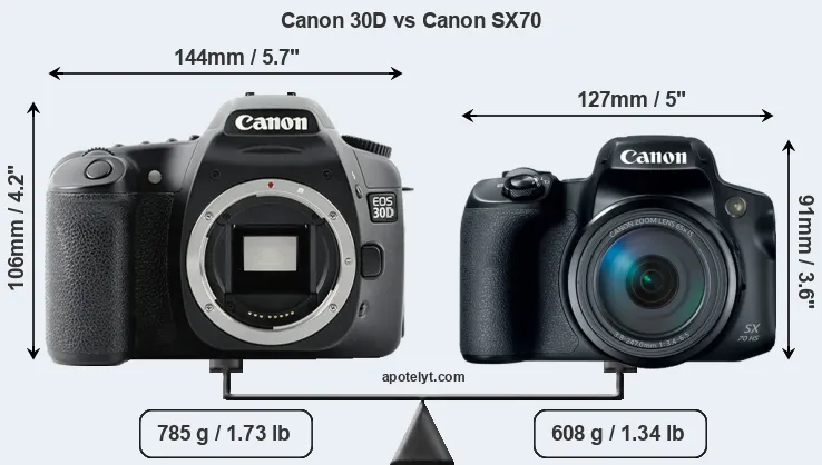 The physical size and weight of the Canon 30D and the Canon SX70 are illustrated in the side-by-side display below. The two cameras are presented according to their relative size. Three successive views from the front, the top, and the rear are shown. All width, height and depth measures are rounded to the nearest millimeter.