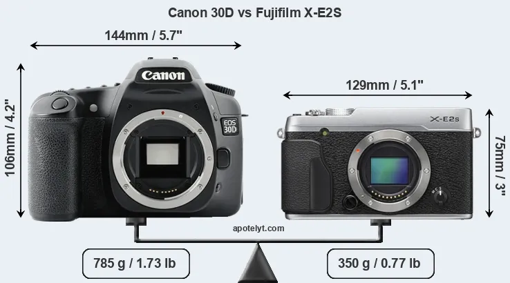 The side-by-side display below illustrates the physical size and weight of the Canon 30D and the Fujifilm X-E2S. The two cameras are presented according to their relative size. Three consecutive perspectives from the front, the top, and the back are available. All width, height and depth dimensions are rounded to the nearest millimeter.