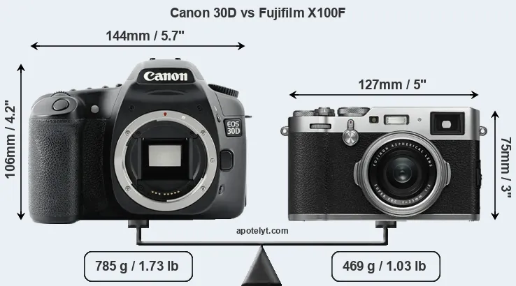 An illustration of the physical size and weight of the Canon 30D and the Fujifilm X100F is provided in the side-by-side display below. The two cameras are presented according to their relative size. Three successive views from the front, the top, and the rear are shown. All width, height and depth dimensions are rounded to the nearest millimeter.