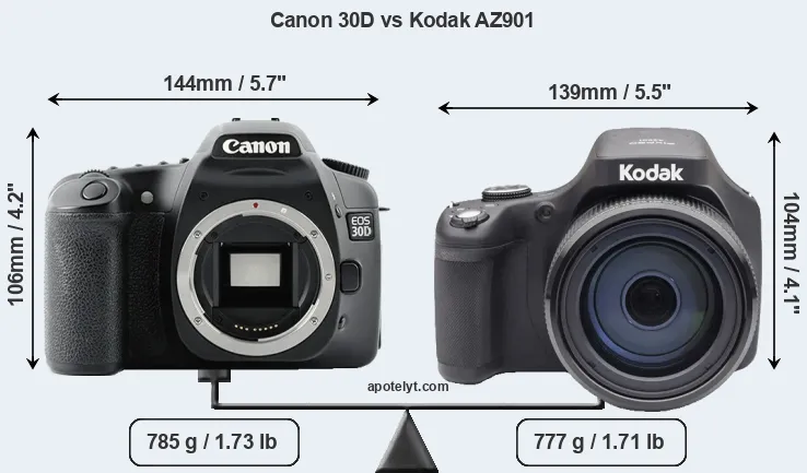 An illustration of the physical size and weight of the Canon 30D and the Kodak AZ901 is provided in the side-by-side display below. The two cameras are presented according to their relative size. Three successive views from the front, the top, and the rear are shown. All width, height and depth measures are rounded to the nearest millimeter.