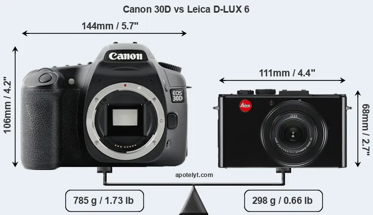 An illustration of the physical size and weight of the Canon 30D and the Leica D-LUX 6 is provided in the side-by-side display below. The two cameras are presented according to their relative size. Three consecutive perspectives from the front, the top, and the back are available. All size dimensions are rounded to the nearest millimeter.