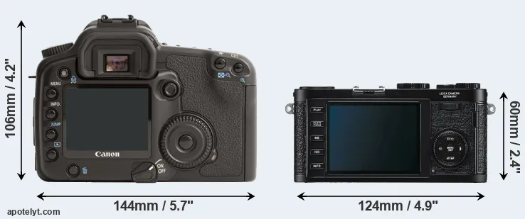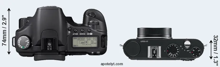 The side-by-side display below illustrates the physical size and weight of the Canon 30D and the Leica X1. The two cameras are presented according to their relative size. Three successive views from the front, the top, and the rear are shown. All size dimensions are rounded to the nearest millimeter.