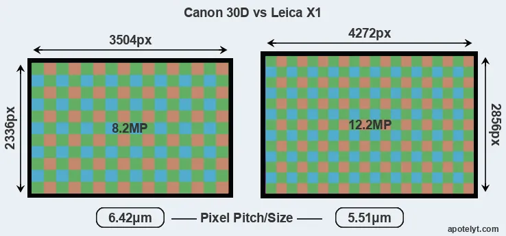 With 12.2MP, the X1 offers a higher resolution than the 30D (8.2MP), but the X1 has smaller individual pixels (pixel pitch of 5.51μm versus 6.42μm for the 30D). Yet, the X1 is a much more recent model (by 3 years and 6 months) than the 30D, and its sensor will have benefitted from technological advances during this time that enhance the light gathering capacity of its pixel-units.