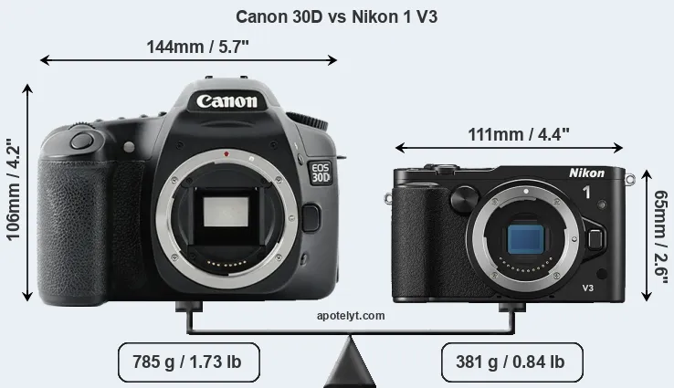 The physical size and weight of the Canon 30D and the Nikon 1 V3 are illustrated in the side-by-side display below. The two cameras are presented according to their relative size. Three consecutive perspectives from the front, the top, and the back are available. All width, height and depth measures are rounded to the nearest millimeter.