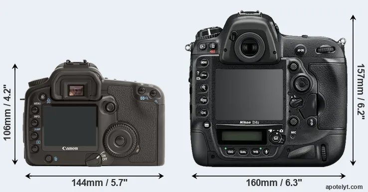 If the front view area (width x height) of the cameras is taken as an aggregate measure of their size, the Nikon D4S is considerably larger (65 percent) than the Canon 30D. Moreover, the D4S is substantially heavier (72 percent) than the 30D. It is noteworthy in this context that the D4S is splash and dust-proof, while the 30D does not feature any corresponding weather-sealing.