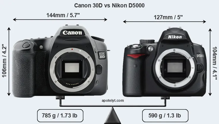 The physical size and weight of the Canon 30D and the Nikon D5000 are illustrated in the side-by-side display below. The two cameras are presented according to their relative size. Three consecutive views from the front, the top, and the rear side are shown. All width, height and depth measures are rounded to the nearest millimeter.