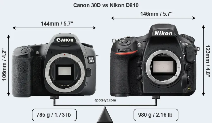 An illustration of the physical size and weight of the Canon 30D and the Nikon D810 is provided in the side-by-side display below. The two cameras are presented according to their relative size. Three successive views from the front, the top, and the rear are shown. All width, height and depth measures are rounded to the nearest millimeter.