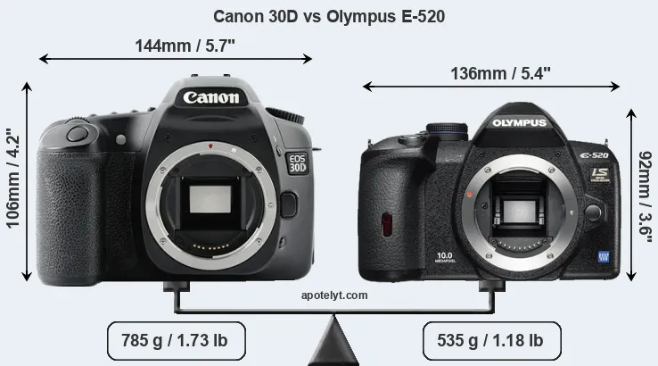 If the front view area (width x height) of the cameras is taken as an aggregate measure of their size, the Olympus E-520 is notably smaller (18 percent) than the Canon 30D. Moreover, the E-520 is markedly lighter (32 percent) than the 30D. In this context, it is worth noting that neither the 30D nor the E-520 are weather-sealed.