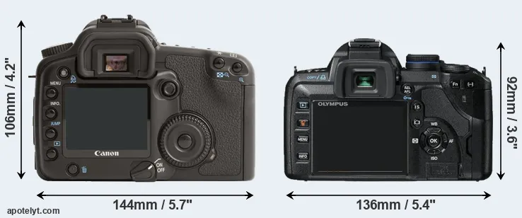 The side-by-side display below illustrates the physical size and weight of the Canon 30D and the Olympus E-520. The two cameras are presented according to their relative size. Three consecutive views from the front, the top, and the rear side are shown. All width, height and depth measures are rounded to the nearest millimeter.