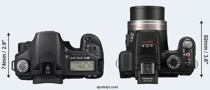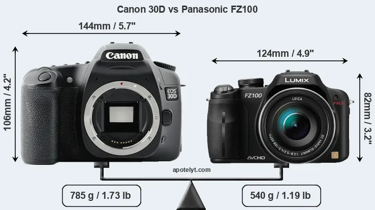 An illustration of the physical size and weight of the Canon 30D and the Panasonic FZ100 is provided in the side-by-side display below. The two cameras are presented according to their relative size. Three successive views from the front, the top, and the rear are shown. All width, height and depth dimensions are rounded to the nearest millimeter.
