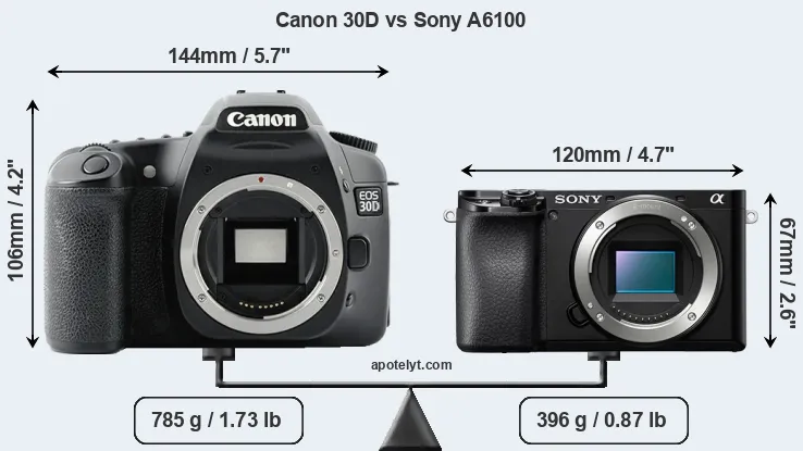 If the front view area (width x height) of the cameras is taken as an aggregate measure of their size, the Sony A6100 is considerably smaller (47 percent) than the Canon 30D. Moreover, the A6100 is substantially lighter (50 percent) than the 30D. In this context, it is worth noting that neither the 30D nor the A6100 are weather-sealed.