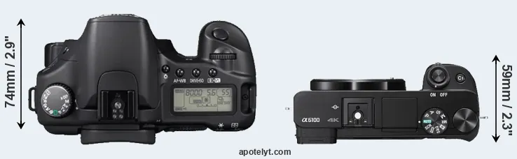 The side-by-side display below illustrates the physical size and weight of the Canon 30D and the Sony A6100. The two cameras are presented according to their relative size. Three consecutive perspectives from the front, the top, and the back are available. All width, height and depth measures are rounded to the nearest millimeter.