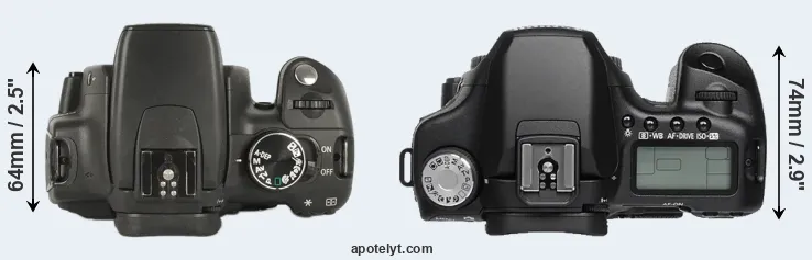 The side-by-side display below illustrates the physical size and weight of the Canon 350D and the Canon 50D. The two cameras are presented according to their relative size. Three consecutive perspectives from the front, the top, and the back are available. All width, height and depth dimensions are rounded to the nearest millimeter.