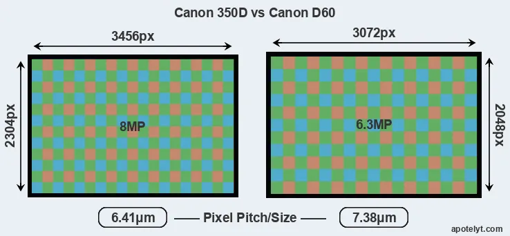 Despite having a slightly smaller sensor, the Canon 350D offers a higher resolution of 8 megapixels, compared with 6.3 MP of the Canon D60. This megapixels advantage comes at the cost of a higher pixel density and a smaller size of the individual pixel (with a pixel pitch of 6.41μm versus 7.38μm for the D60). However, it should be noted that the 350D is much more recent (by 2 years and 11 months) than the D60, and its sensor will have benefitted from technological advances during this time that make it possible to gather light more efficiently.