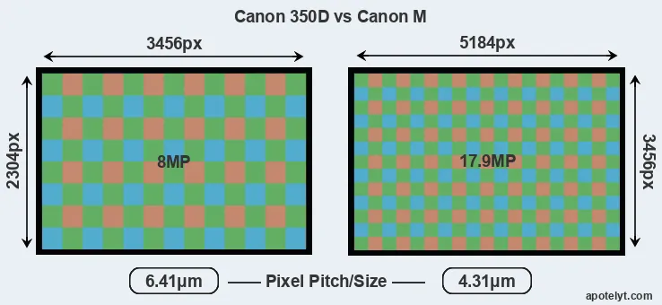 With 17.9MP, the Canon M offers a higher resolution than the 350D (8MP), but the Canon M has smaller individual pixels (pixel pitch of 4.31μm versus 6.41μm for the 350D). Yet, the Canon M is a much more recent model (by 7 years and 5 months) than the 350D, and its sensor will have benefitted from technological advances during this time that enhance the light gathering capacity of its pixel-units.