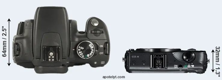 The side-by-side display below illustrates the physical size and weight of the Canon 350D and the Canon M. The two cameras are presented according to their relative size. Three consecutive perspectives from the front, the top, and the back are available. All width, height and depth dimensions are rounded to the nearest millimeter.