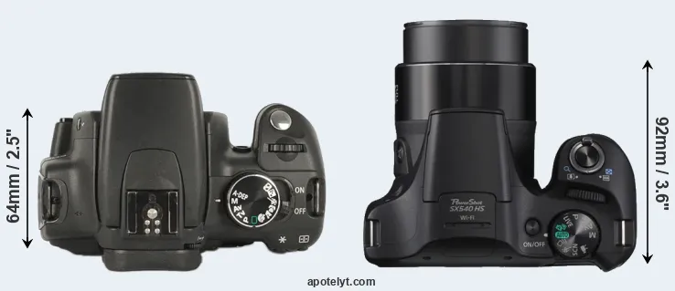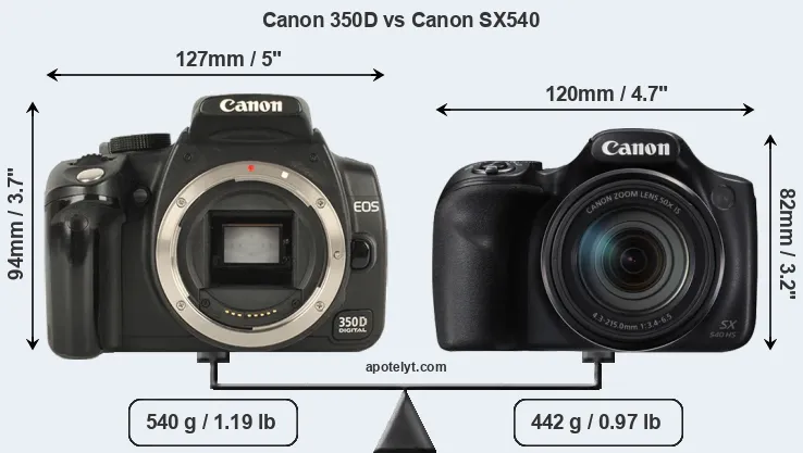 An illustration of the physical size and weight of the Canon 350D and the Canon SX540 is provided in the side-by-side display below. The two cameras are presented according to their relative size. Three successive views from the front, the top, and the rear are shown. All width, height and depth dimensions are rounded to the nearest millimeter.