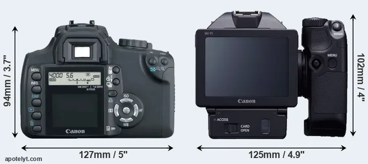 The side-by-side display below illustrates the physical size and weight of the Canon 350D and the Canon XC10. The two cameras are presented according to their relative size. Three consecutive perspectives from the front, the top, and the back are available. All width, height and depth measures are rounded to the nearest millimeter.